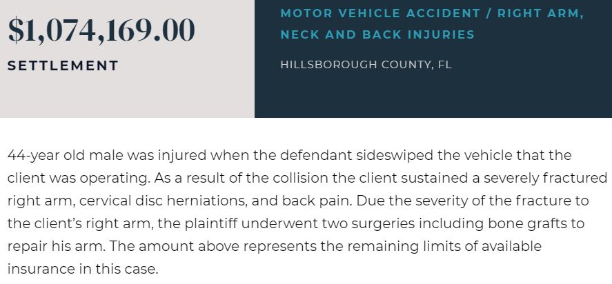 Tras una larga negociación de varios días, conseguimos convencer a la compañía de seguros de que pagara bastante más de lo que había ofrecido anteriormente. El caso se resolvió varios días después de la mediación por 525.000,00 dólares. El importe del acuerdo era más de 10 veces superior a su oferta original. Nos alegramos de haber conseguido que nuestro cliente recibiera una indemnización adecuada por sus lesiones.
